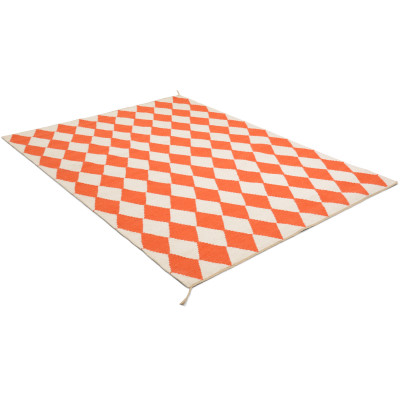 En fin handvävd ullmatta med varp av lin, en matta med hög kvalitet med ett mönster som kallas för harlequin. Detaljer som den avslutande linkanten med tillhörande tofs i två hörn förhöjer mattans intryck ytterligare. Mattan tillverkas av det svenska företaget Axeco. Här i färgen orange.Fotograferad i storlek 170 x 230 cm